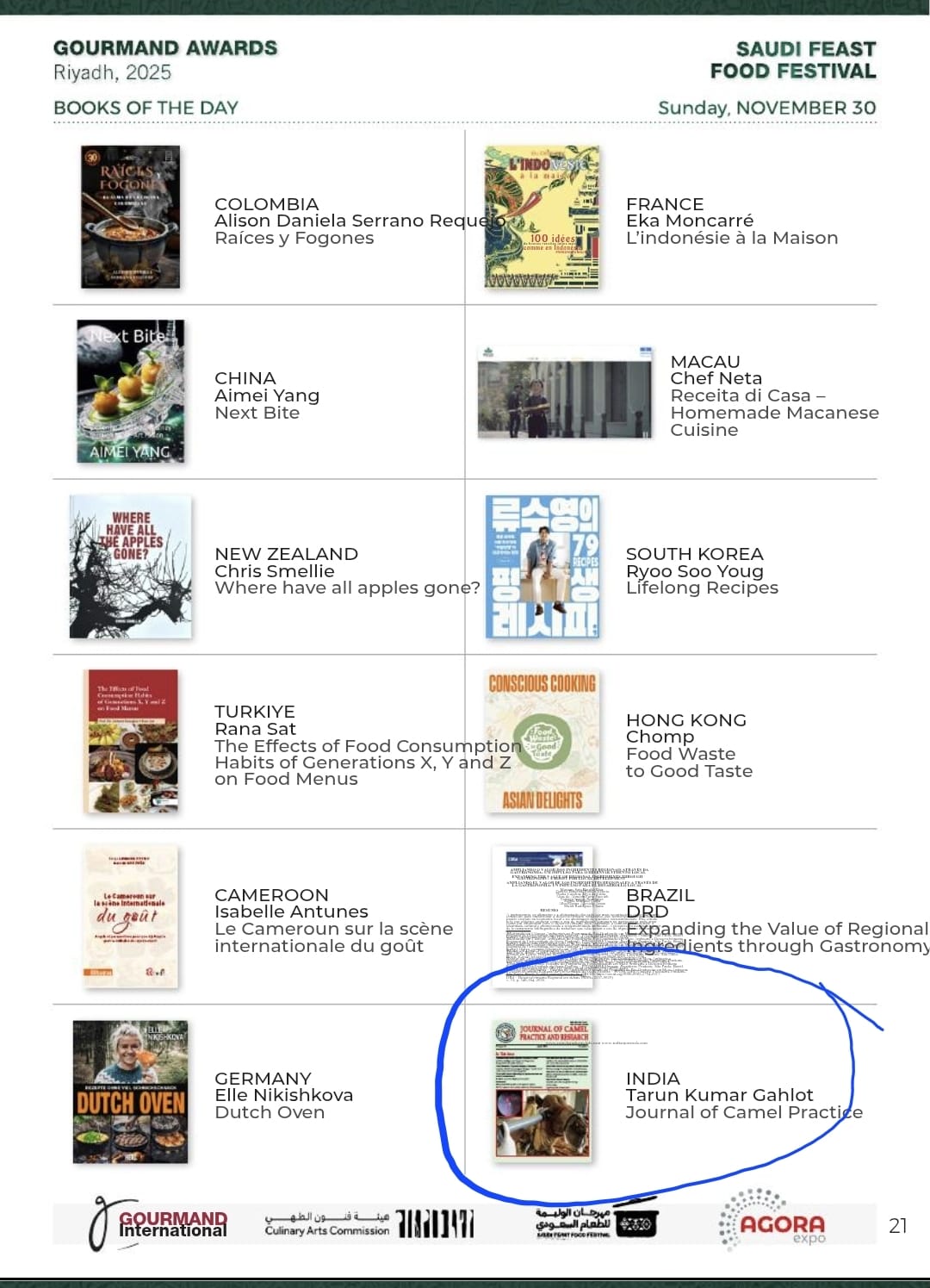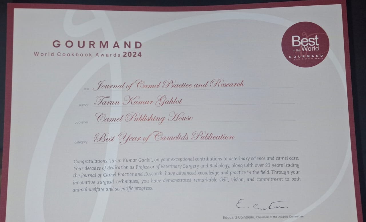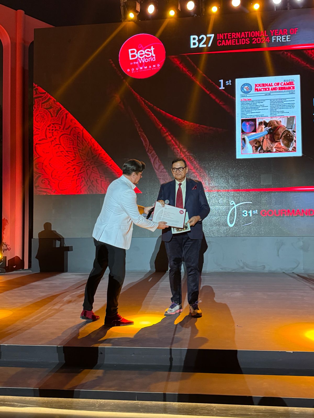 An exclusive journal on camels, being published and edited by Dr Tarun Kumar Gahlot for the last 32 years from the desert camel city Bikaner of Rajasthan, State of India, has been conferred the prestigious 30th Gourmand award. This award is an acknowledgement of the journal’s contribution to the body of knowledge surrounding camel products, culture, and their potential role in food systems, especially in the context of the International Year of Camelids 2024. The Journal of Camel Practice and Research received a Gourmand Award at the 31st Gourmand Awards ceremony in Riyadh, Saudi Arabia, held on November 30, 2025. Editor-in-Chief Dr. Tarun Kumar Gahlot, who founded the journal in 1994, received the award in person.